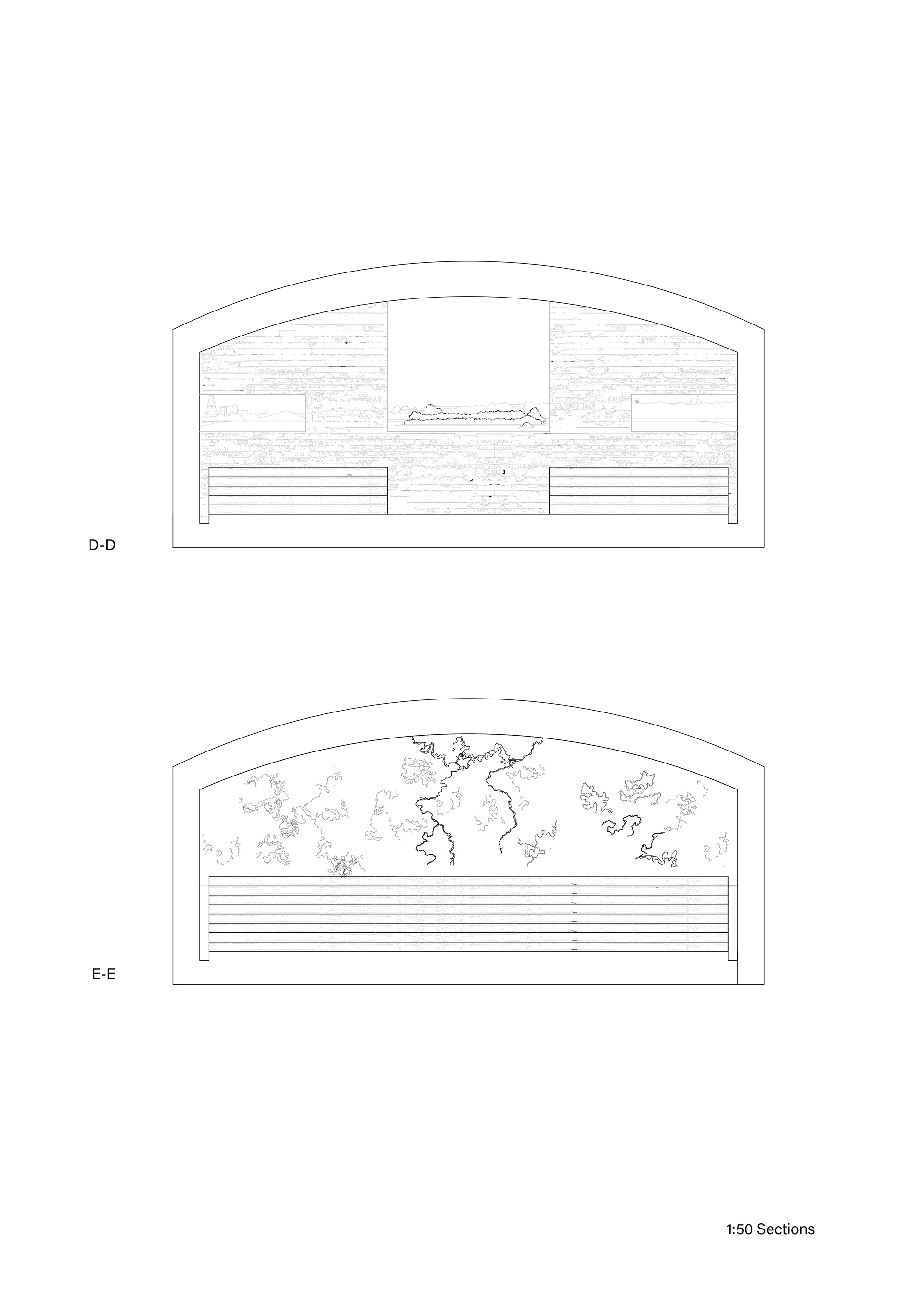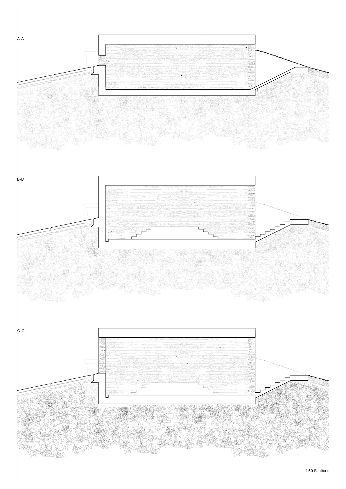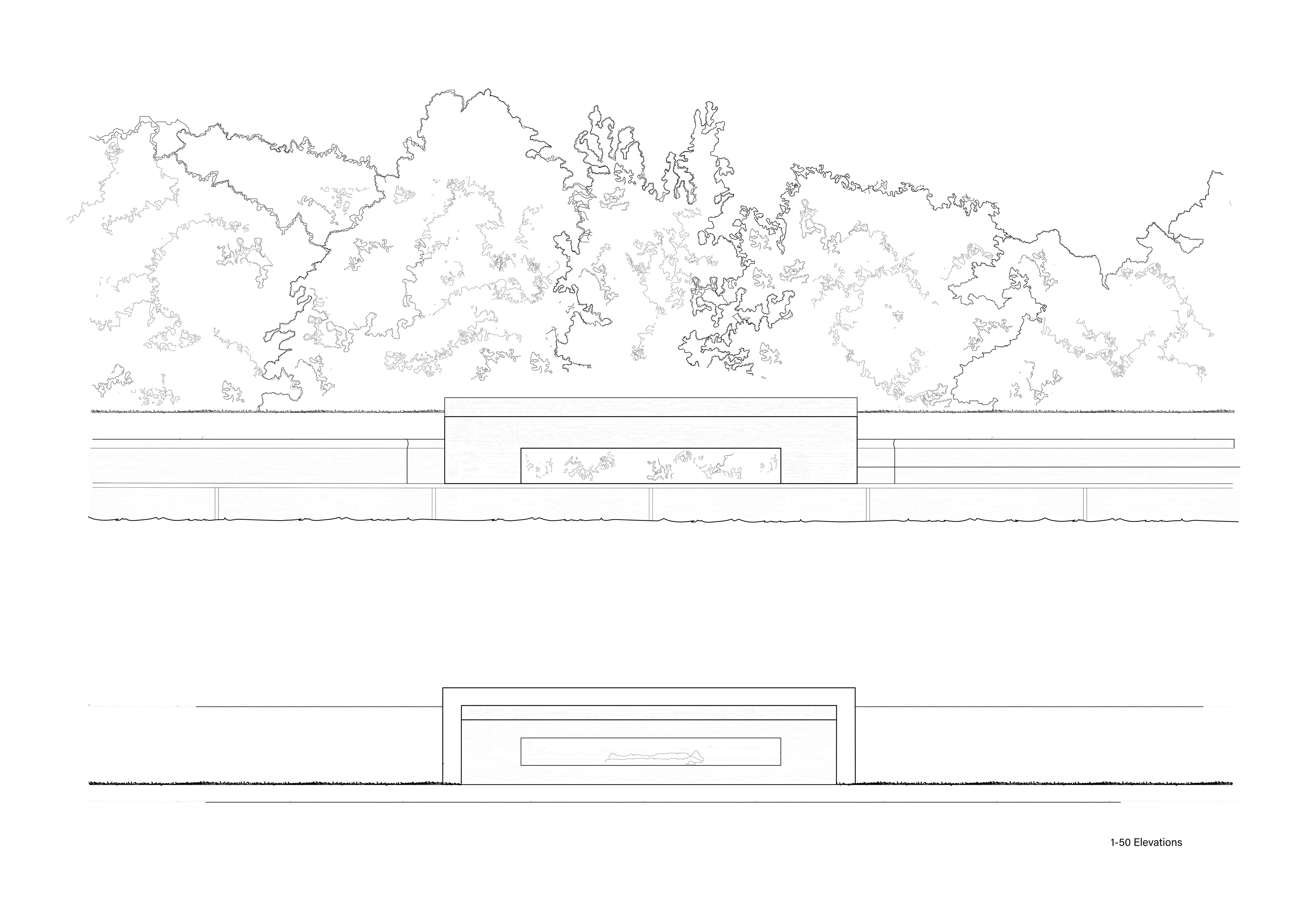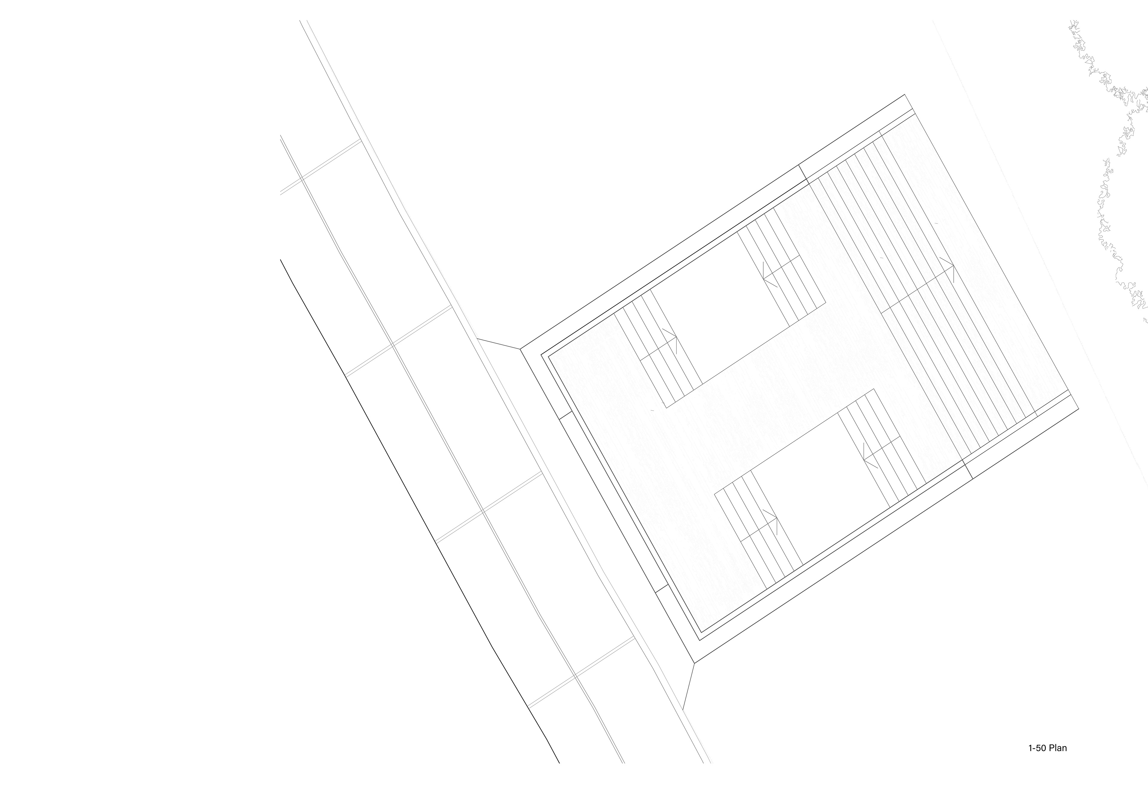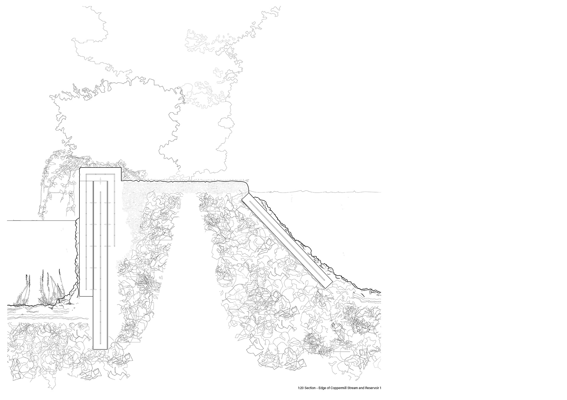 A design proposal for a viewing area within Walthamstow Reservoirs. Through examining through drawing the edges of different bodies of water and the varying levels of artificiality between them came the proposal for a sunken viewing area embedded along the edge of a reservoir, providing views just above water level.